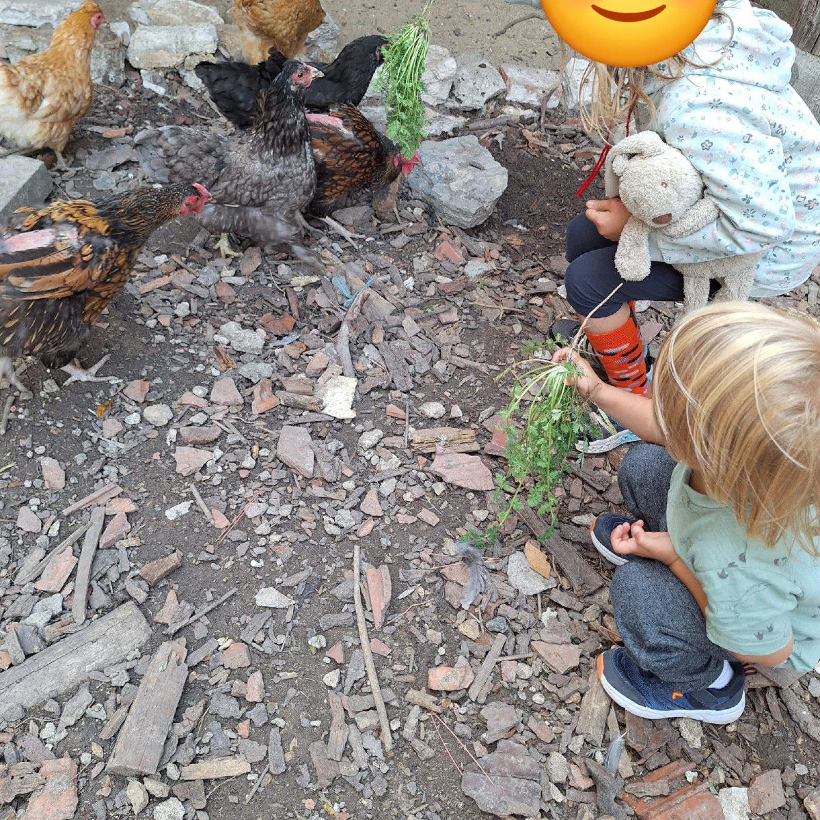 Bei der Versorgung der Hühner und Hasen dürfen sich die Kinder mit einbringen. Sei es bei der Fütterung, beim Einsammeln der Eier oder einfach dem Verteilen der ein oder anderen Streicheleinheit. Die Tiere sind den Umgang mit den Kindern gewohnt und lassen sich daher anfassen.